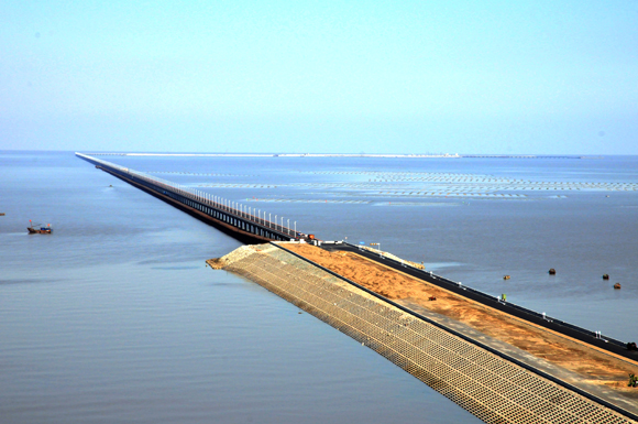 2006年10月28日正式開工。工程建設人員依靠6090米的棧橋和大型船機設備施工,克服施工條件惡劣、作業戰線長、工序繁雜等困難,用一年零8個月的時間,把長達10050米、寬11.5米的陸島通道(12.6公里)的控制性工程黃海大橋建成。目前,黃海大橋是長度和規模列居國內第二的外海深水大橋,是國內第一座真正意義上的無遮掩外海最長的橋梁。 黃海大橋是連接人工島與后方臨港工業區的唯一交通通道。工程于2006年下半年開工建設,2008年底建成通車。 黃海大橋全長10.05km,其中淺水區6.09km,深水區3.96km。橋面總寬11.5m,行車道凈寬9.0m,為雙向2車道。 大橋的車輛荷載等級為公路-Ⅰ級。大橋淺水區下部采用雙柱式門架墩、鉆孔灌注樁基礎,上部結構為跨徑30米的組合箱梁;深水區下部采用圓承臺接實體墩、打入樁基礎,上部結構為跨徑40米的組合箱梁。 |